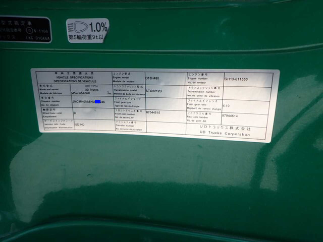 | Make | UD TRUCKS | Engine Code | GH13 | Max Loading Capacity | 38,280[11,500]kg |