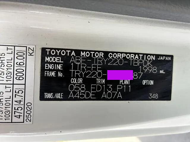 | Make | TOYOTA | Engine Code | 1TR | Max Loading Capacity | 1,100kg |